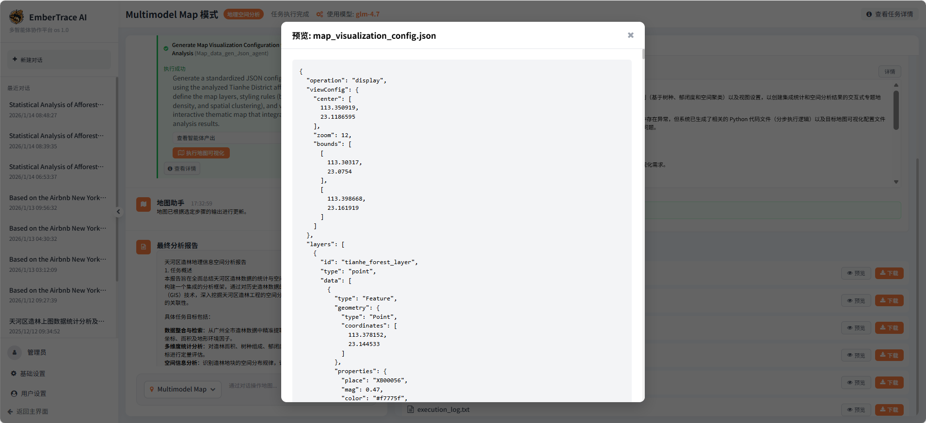 本任务全程无人为干预,三大智能体协作流畅:搜索→分析→配置,闭环完整。系统不仅完成数据筛选、统计建模与空间可视化,还输出可直接调用的地图配置文件,体现了EmberTrace AI在多智能体任务编排、专业GIS分析自动化与成果落地一体化方面的成熟能力。这种"分析即配置"的流程,正是面向业务的地图智能系统核心价值所在。