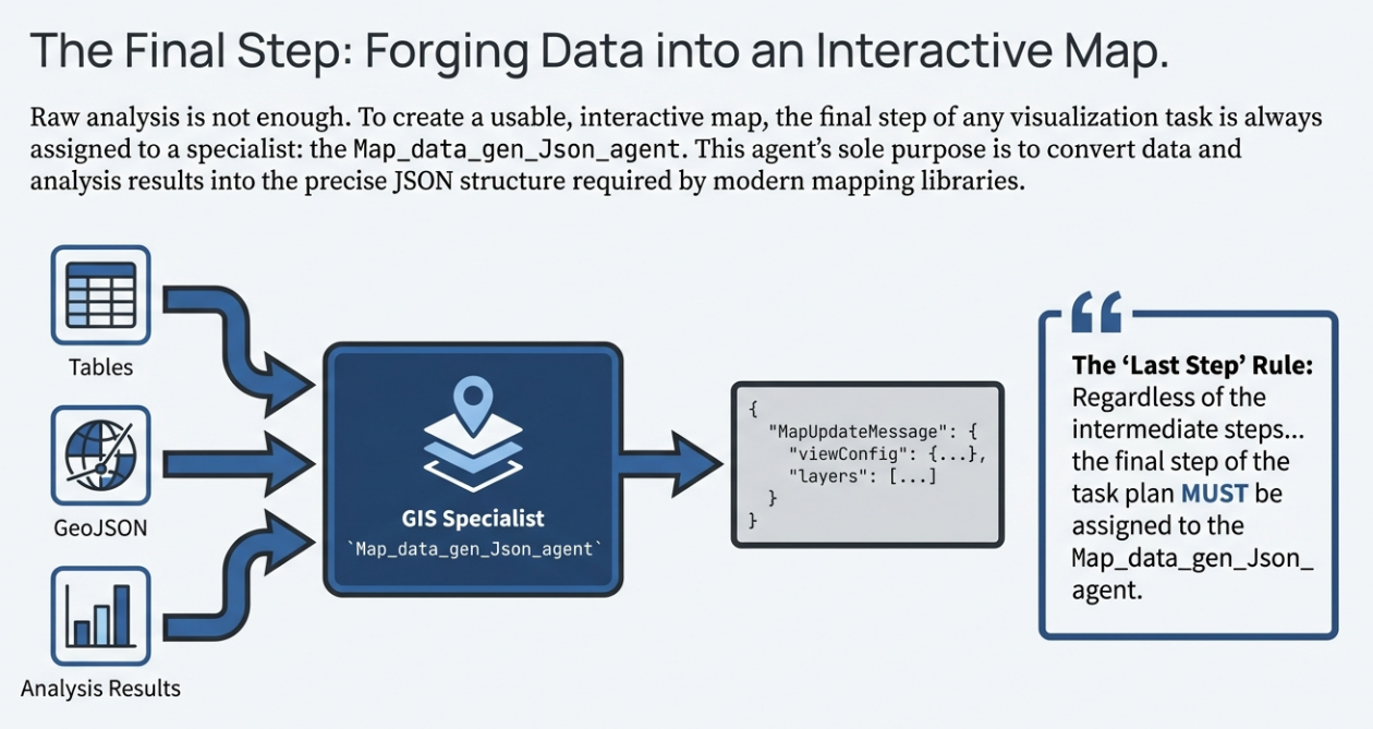 地图分析的最终产物必须是直观的、可交互的。源代码中明确规定了 "Last Step Rule" :无论中间经历了多少次复杂的数据抓取或空间建模,任务计划的最后一步必须分配给 Map_data_gen_Json_agent。