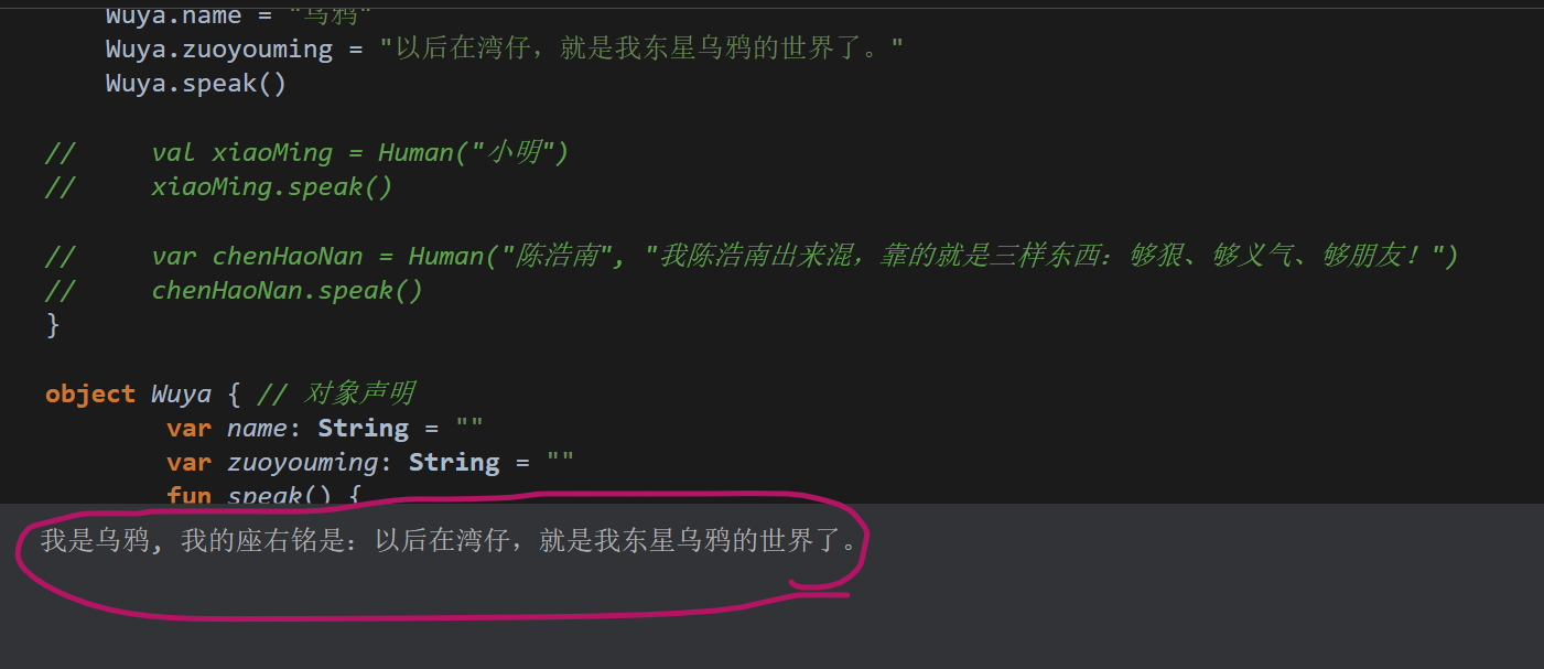 println("我是$name, 我的座右铭是:$zuoyouming")