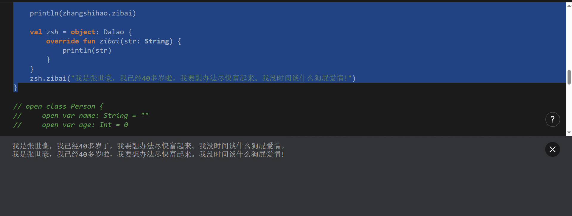 var zibai: String = "我是张世豪,我已经40多岁了,我要想办法尽快富起来。我没时间谈什么狗屁爱情。"
