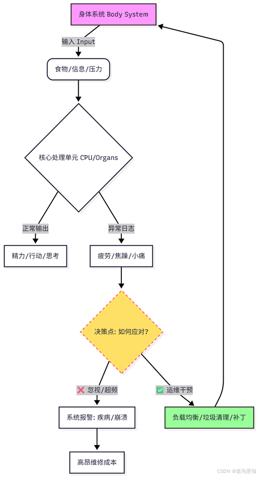 服务器亮红灯,我们会查日志、做负载均衡、甚至赶紧扩容。但身体亮红灯(疼了、累了、失眠了),我们的反应通常是: