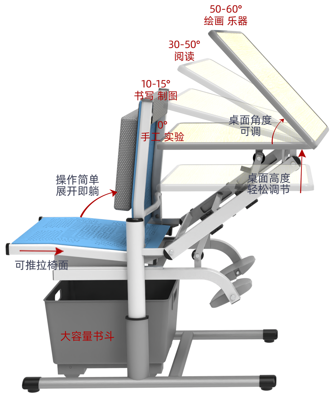 校金刚午休课桌椅 具备行业领先的桌面角度无级调节功能 ,以适配不同学习场景的最佳视距,从物理层面解决低头问题:- 10°-15°(书写): 校金刚将此角度设为书写黄金角,减少颈椎前屈压力,书写更流畅。