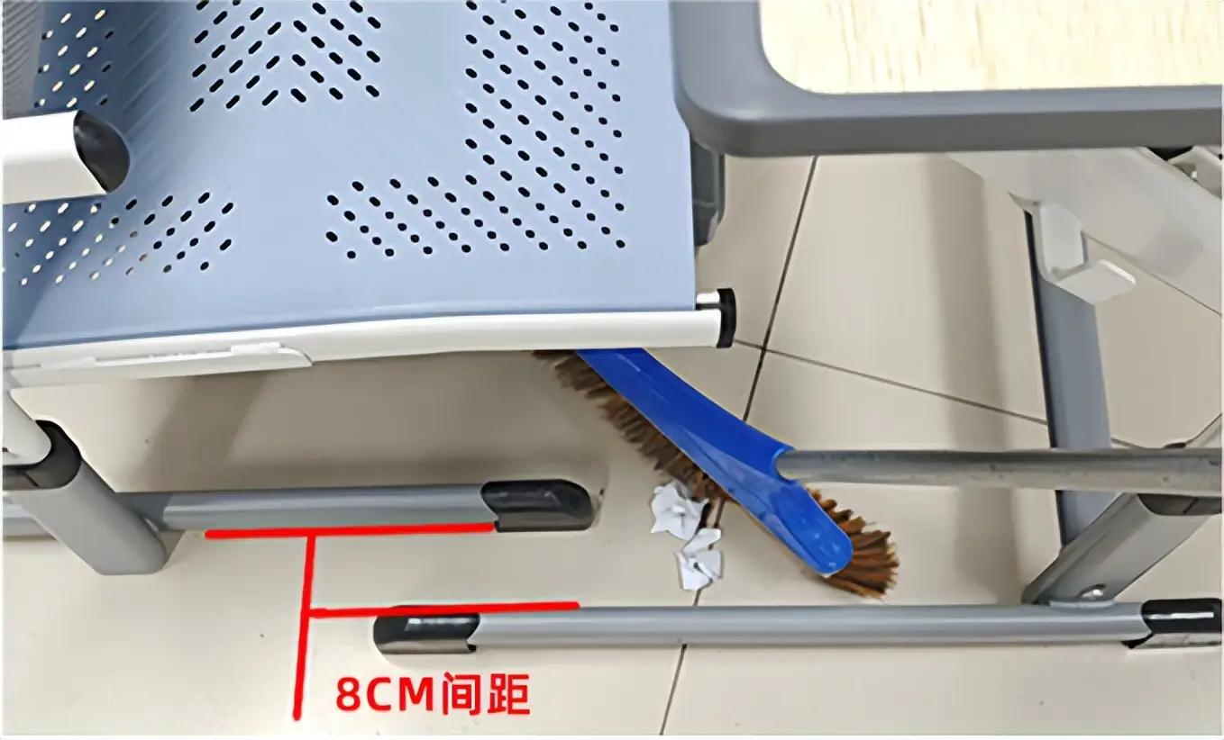 出于所谓的"稳固"考虑,传统设计常采用纵横交错的横梁,在地面围成多个封闭空间。这些扫把、拖把进不去的死角,长期积存灰尘垃圾,滋生病毒细菌,直接威胁免疫力低下的学生群体。 - 校金刚的开放型底脚(健康防线):