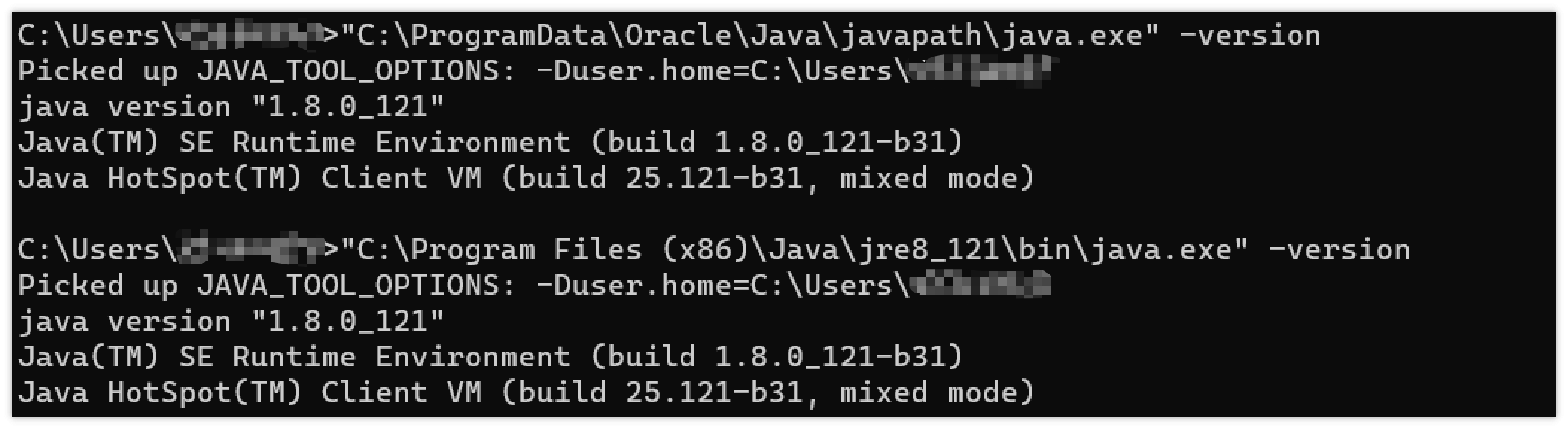 最前面那个是优先级最高、如果直接使用不完整路径访问的时候就是它生效,它是32位的,并且进一步可以看到前面2个路径的 java.exe 都没有输出 64 Bit 的信息,证明其实都是 32 位的,都是一些奇怪的地方引入的JRE