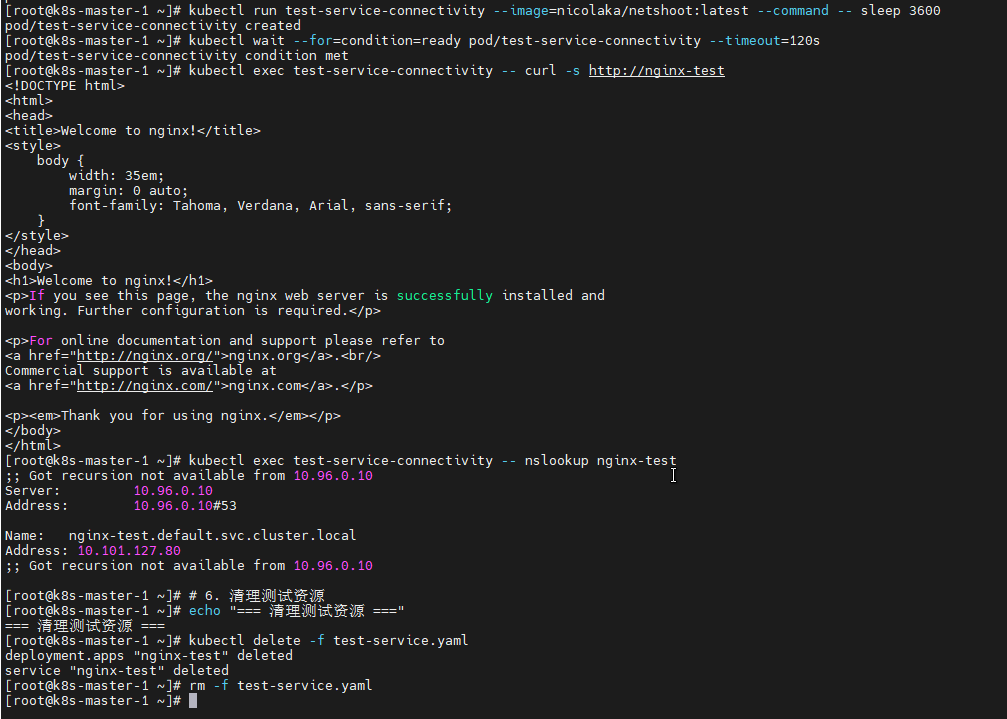 kubectl exec test-service-connectivity -- nslookup nginx-test
