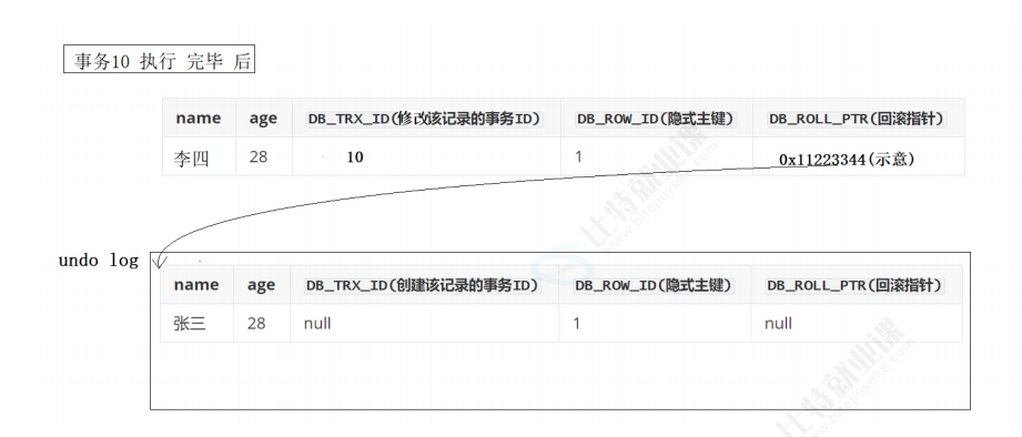 记录的隐藏字段 DB_TRX_ID 为当前 事务 10 的 ID, 我们默认从 10 开始,之后递增。而原始记录的回