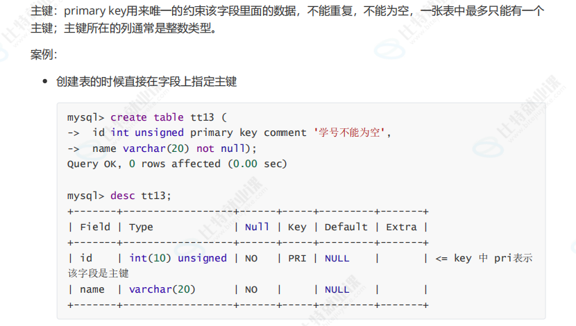 下面就是关键的了,主键约束,这个非常关键,看一下这个例子,主键约束,表示这列的数值不能为空,全局唯一,不能重复,且一个表最多有一个主键,必须有,没有MySQL会默认添加一个主键约束,用户看不到,用户定义了就不再默认添加主键约束,主键是构建聚簇索引B+树的一个关键,支持了高效的数据查找。