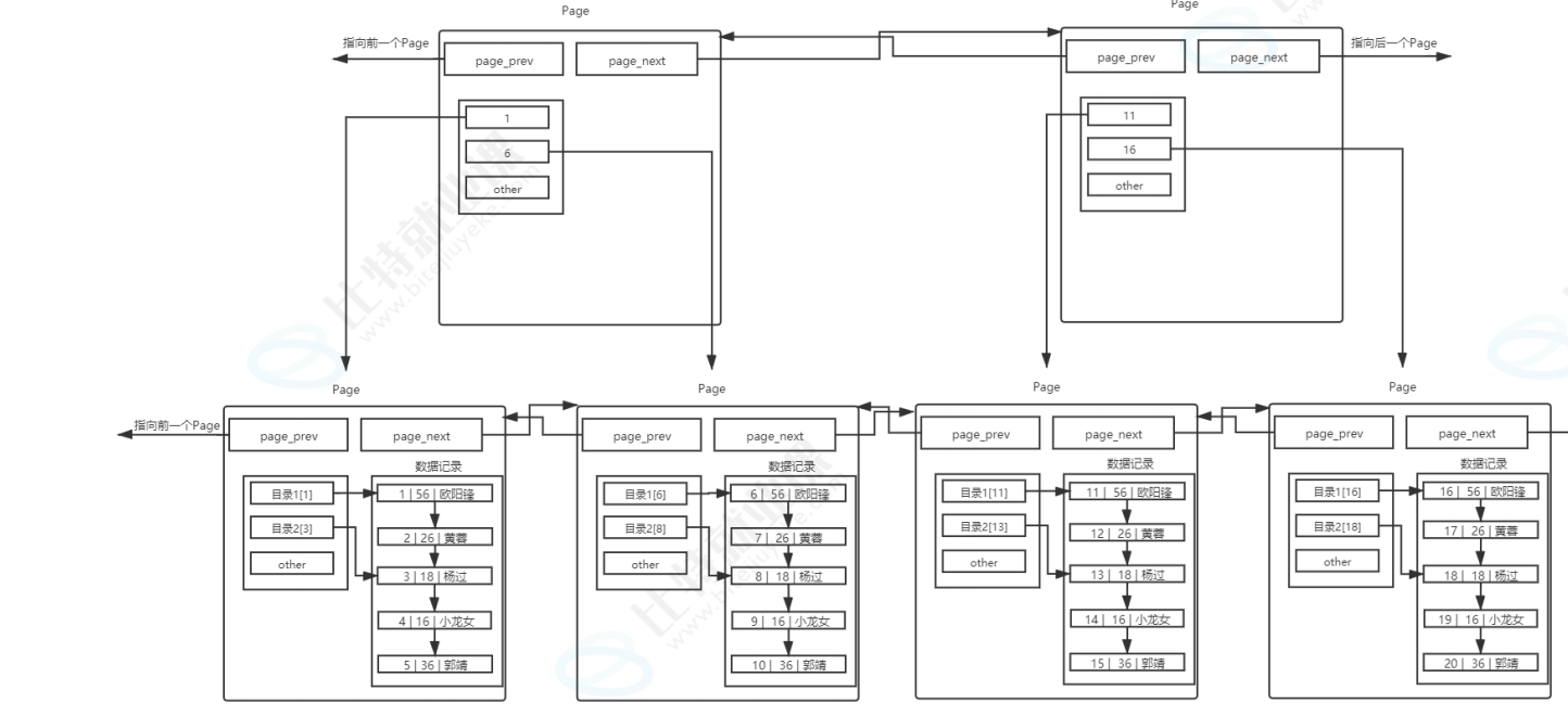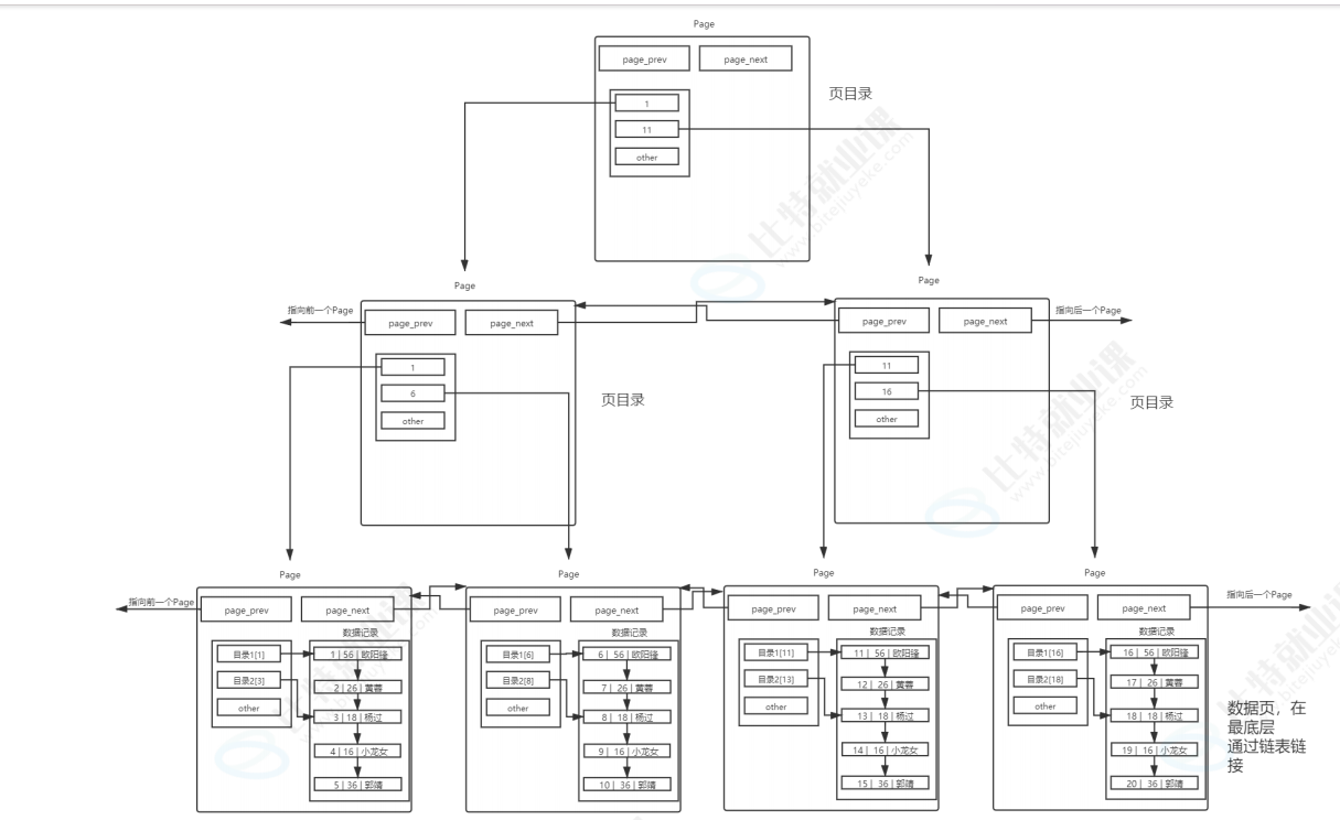 这样我们通过page目录就可以定位我们的page的大概范围,比如要找16,我们就无需去遍历前3个page了,我们直接从第三个page开始找就可以了。随着page的增多,我们的目录页也需要进行遍历了,怎么办,再加目录,给目录加目录套娃,无需真正理解,这是一种思想,给目录加目录,可以加速定位,这就是B+树
