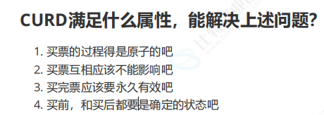 所以我们就要保证,买票的过程是原子的,也就是说,要买就买,不买就不买,不存在中间状态,意思就是你数据库的数据必须是即使更新的,当我A把票买完的时候,买票这个动作结束之前,你B不可以来买票,这叫原子。没有买票中这个状态,同样的,当我B买票之后,你A不能再次买票,不能把一张票进行2次购买,买完票后是永久有效的,买前和卖后都是确定的状态。