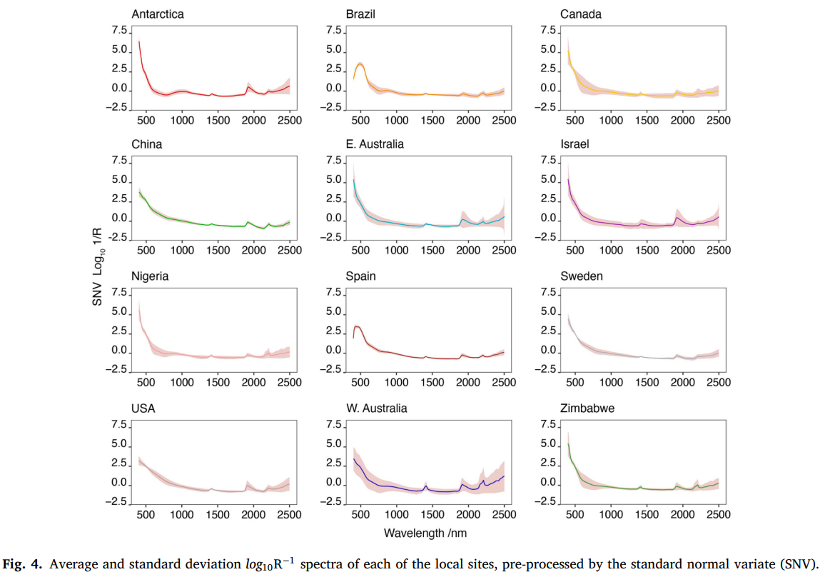 图 3a 展示了 GSSL 2.0 中样品的空间分布。将 GSSL 2.0 的反射光谱转换为表观吸光度(公式:A=log10R−1,其中 R 为反射率),然后采用标准正态变量(SNV)转换进行标准化(Barnes et al., 1989)。图 3b 展示了按大洲划分的预处理后光谱。