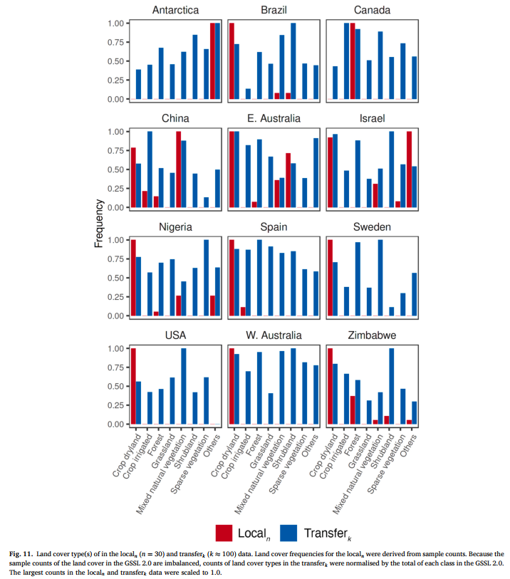 图 11 展示了每个局部位点的土地覆盖类型,以及 transferk 数据的土地覆盖类型。总体而言,transferk 选择观测值中最主要的土地覆盖类型,与局部位点的土地覆盖类型一致。