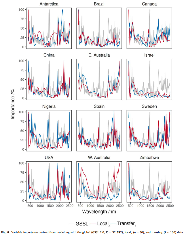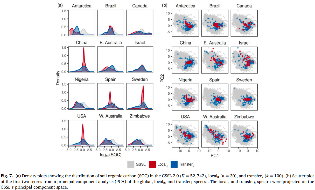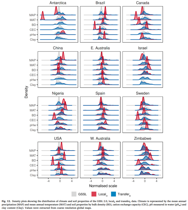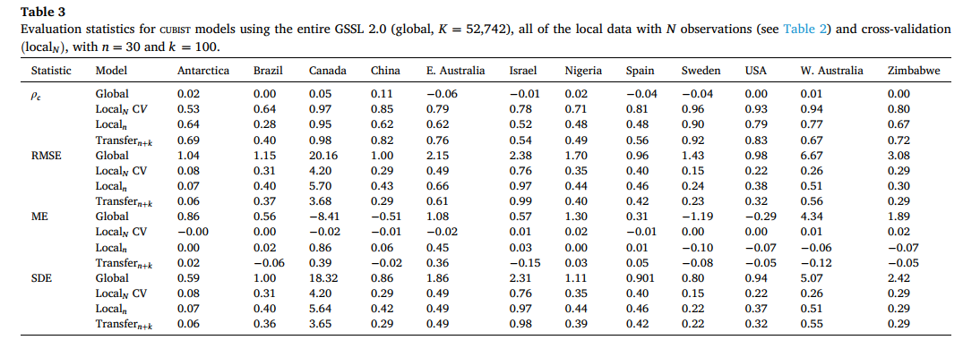 本研究测试了来自 10 个国家(加拿大、美国、巴西、瑞典、西班牙、以色列、尼日利亚、津巴布韦、中国和澳大利亚)以及南极洲一个地区(罗斯属地)的局部数据集 ------ 这些数据集独立于 GSSL 2.0,覆盖各大洲,土壤用途包括种植、草地、森林和灌丛。这些局部数据代表了田块内、田块、农场和区域尺度的土壤。