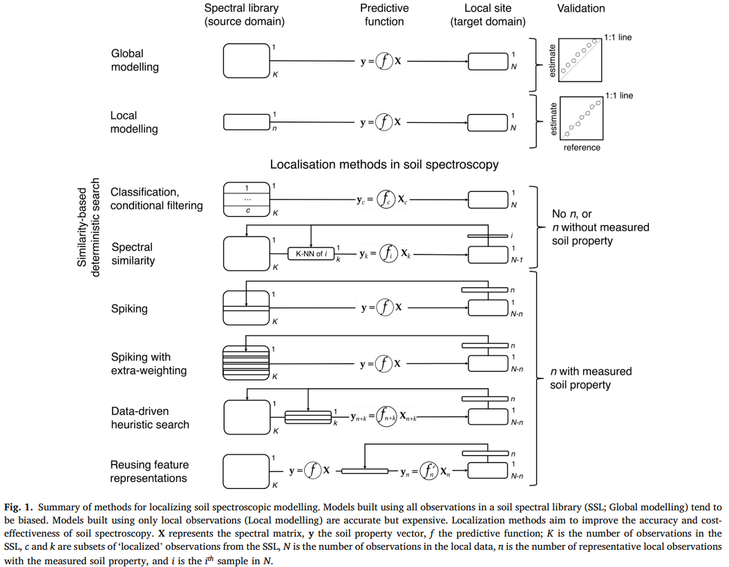 图1。土壤光谱建模局部化方法综述。利用土壤光谱库中的所有观测数据建立的模型(SSL;全局建模)往往存在偏差。仅使用局部观测建立的模型(局部建模)是准确的,但代价昂贵。定位方法的目的是提高土壤光谱的准确性和成本效益。X为谱矩阵,y为土壤性质向量,f为预测函数;K是SSL中观测值的个数,c和K是来自SSL的"局部"观测值的子集,N是局部数据中的观测值个数,N是具有测量土壤性质的代表性局部观测值的个数,i是N中的第i个样本。