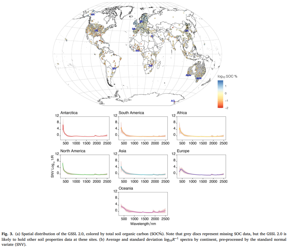 图 3. (a) GSSL 2.0 的空间分布(按土壤有机碳(SOC)总量百分比着色)。注:灰色圆点表示土壤有机碳(SOC)数据缺失,但 GSSL 2.0 在这些位点可能包含其他土壤属性数据。(b) 按大洲划分的平均和标准差 log10R−1 光谱(经标准正态变量(SNV)预处理)。