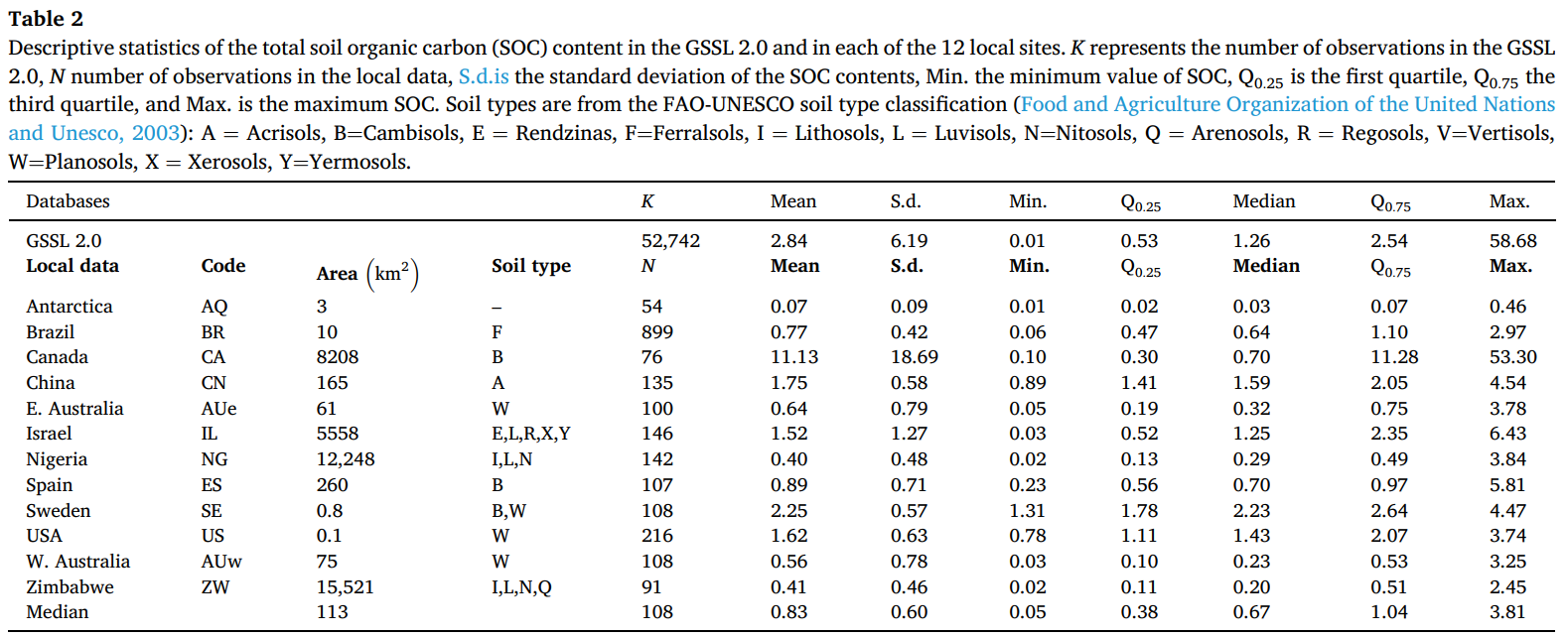 表 2 GSSL 2.0 和 12 个局部位点的土壤有机碳(SOC)含量描述性统计。K 表示 GSSL 2.0 中的观测值数量,N 表示局部数据中的观测值数量,S.d. 表示土壤有机碳(SOC)含量的标准差,Min. 表示土壤有机碳(SOC)最小值,Q0.25 表示第一四分位数,Q0.75 表示第三四分位数,Max. 表示土壤有机碳(SOC)最大值。土壤类型依据联合国粮食及农业组织 - 联合国教科文组织(FAO-UNESCO)土壤类型分类(联合国粮食及农业组织和联合国教科文组织,2003):A = 淋溶土,B = 雏形土,E = 黑色石灰土,F = 铁铝土,I = 石质土,L = 淋溶土,N = 黏磐土,Q = 砂土,R = 粗骨土,V = 变性土,W = 潜育土,X = 干旱土,Y = 荒漠土。
