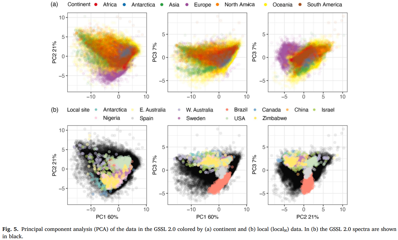 预处理后的 GSSL 2.0 光谱的主成分分析(PCA)得分总体上相互重叠,表明七大洲土壤的矿物 - 有机组成存在细微差异(图 5)。欧洲光谱扩展了 GSSL 2.0 的特征空间(图 5),这与北半球温带地区土壤在 GSSL 2.0 中占比较高有关(图 3a)。将 12 个局部位点的局部光谱投影到全球(特征)空间后发现,局部光谱大多落在 GSSL 2.0 的特征空间内(图 5),表明 GSSL 2.0 包含与局部位点光谱相似的样本。