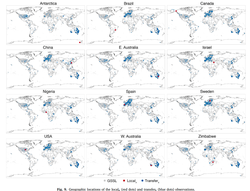 对 transferk 数据的地理分布分析表明,仅地理因素无法解释 RS-LOCAL 2.0 从 GSSL 向局部位点的迁移机制(图 9),但可识别出一些总体模式。每个位点的 transferk 实例来自全球多个地区,但主要来自美国、欧洲、中国和澳大利亚 ------ 这些地区是 GSSL 2.0 数据的主要贡献者(图 3)。RS-LOCAL 2.0 从 GSSL 2.0 中选择的 transferk 实例,超出了 localn 数据的地理空间范围,这意味着全球任何地区的观测值,都可能与其他地区的观测值存在关联(推测是由于相似的土壤气候条件),并有助于迁移学习和局部估算。