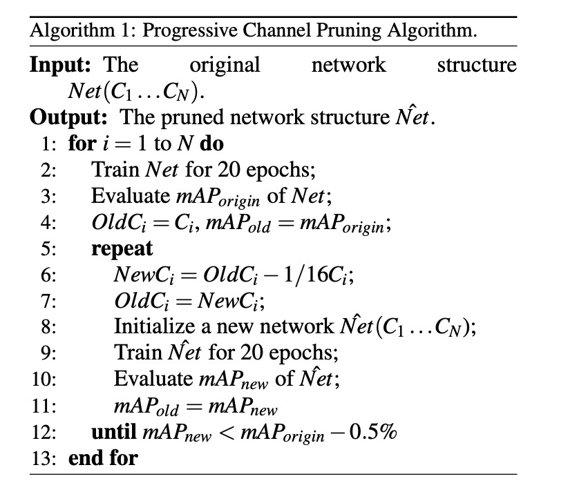 因此,研究者提出了一种渐进式剪枝方法来在修改后的网络中搜索"更薄"的架构。具体伪代码流程如下: