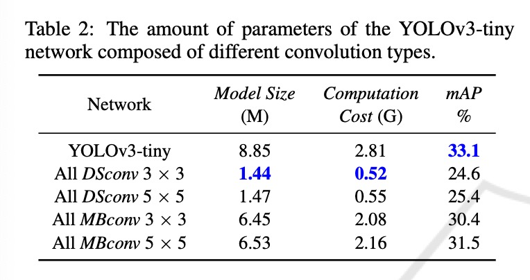 本文探讨了多种模型压缩方法,并提出了一种基于YOLOv3-tiny的改进型目标检测架构------Micro-YOLO。我们分析了几种类型的卷积层,例如深度可分离卷积(DSConv)和带有挤压激励模块的倒置瓶颈卷积(MBConv),以确定适用于Micro-YOLO网络的最佳层类型。同时,我们研究了这些卷积层中不同卷积核尺寸对Micro-YOLO性能的影响。