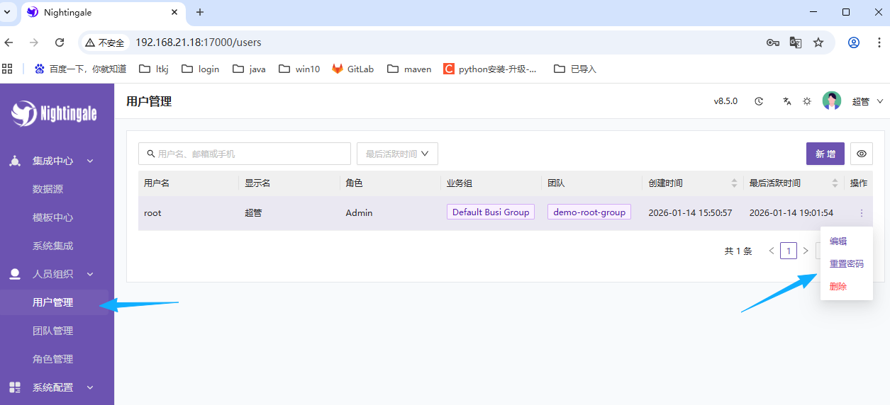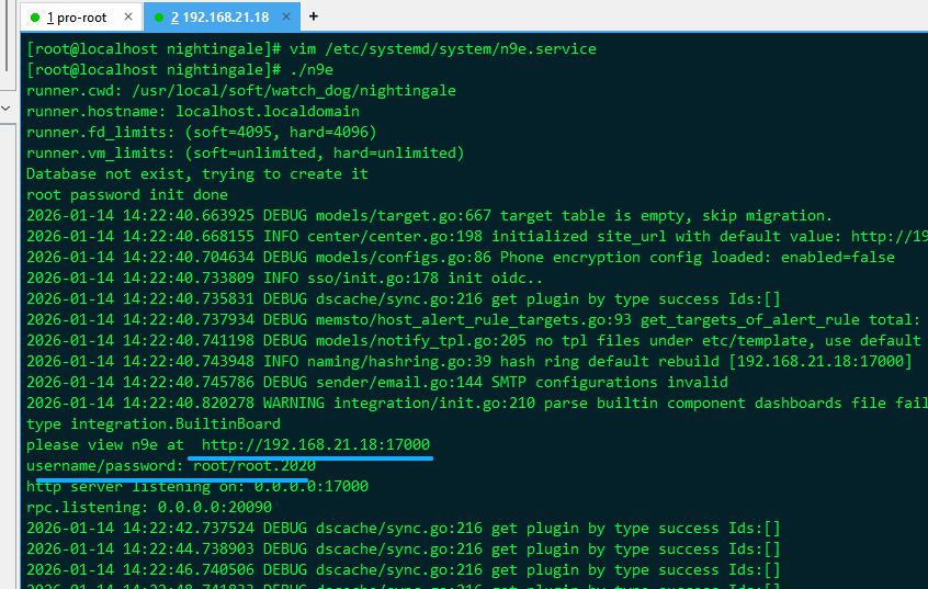不管是哪种安装方式,安装完成后,夜莺的默认用户名是 root,密码是 root.2020。夜莺默认监听的端口是 17000,边缘模式下用的 n9e-edge 端口是 19000。