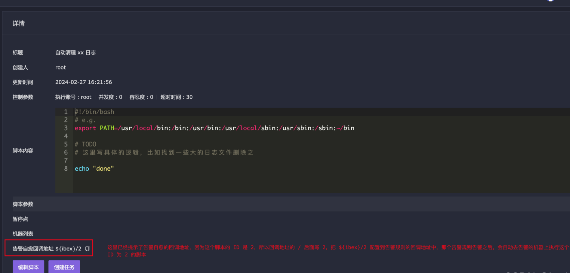 配置自定义脚本。相当于一个任务模板,基于脚本创建任务时会自动填充相关字段。告警规则中可以配置回调地址为 ${ibex}/345,其中 345 这个数字表示脚本的 ID,告警事件产生之后,会把告警事件的信息传给脚本,脚本去做一些自动化的动作。去哪个机器执行?就是去告警的机器执行,告警自愈场景下,会忽略脚本中默认配置的机器列表。下图是一个脚本的详情页面: