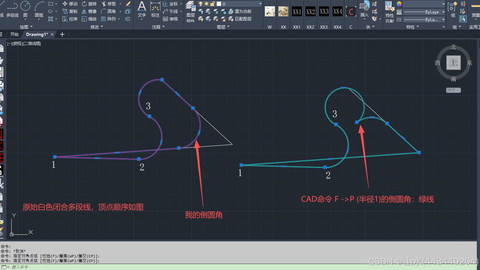 经测试CAD2024中闭合多段线倒圆角(半径1),效果如下: