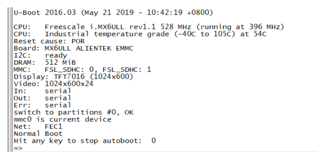 可以看出, Board 变成了" MX6ULL ALIENTEK EMMC "。至此 uboot 的驱动