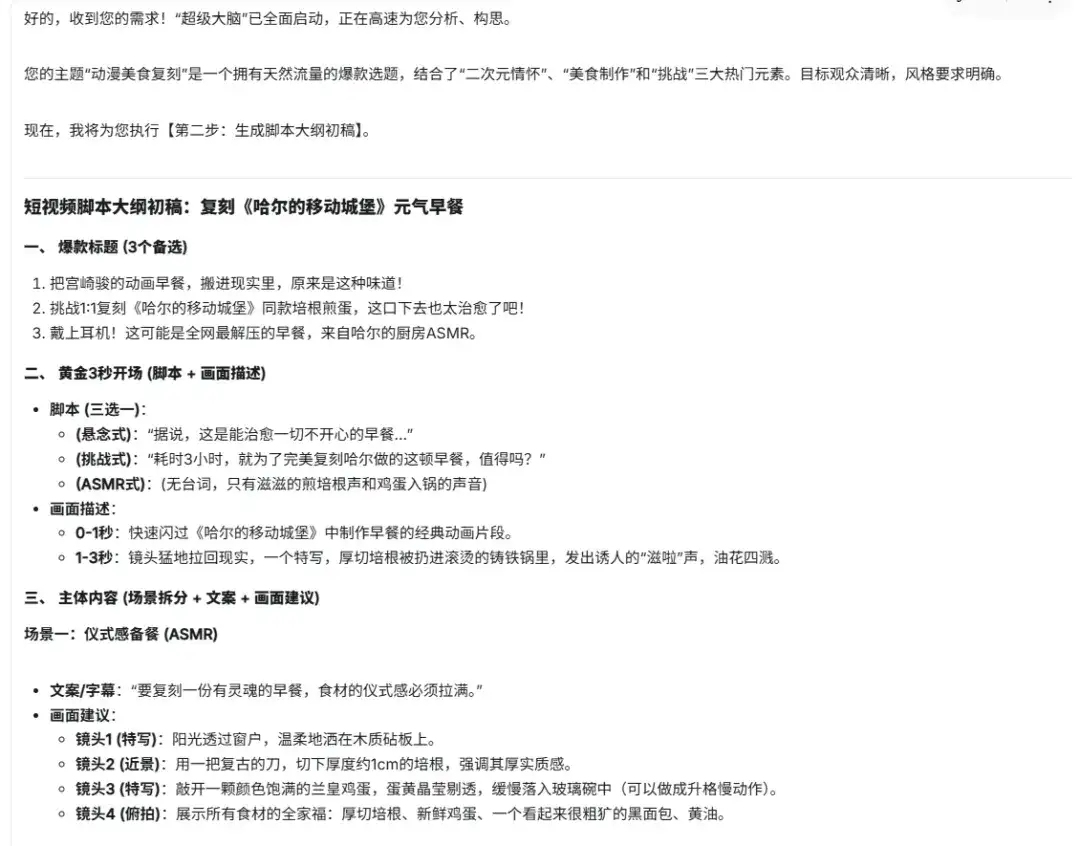 别担心,今天这篇文章,就是为你量身打造的"灵感发动机"。我将为你公开一个"喂饭级"的AI提示词,它就像一个全天候待命的创意军师,你只需要给它一个方向,它就能帮你搭建出逻辑清晰、亮点突出、结构完整的短视频脚本大纲。