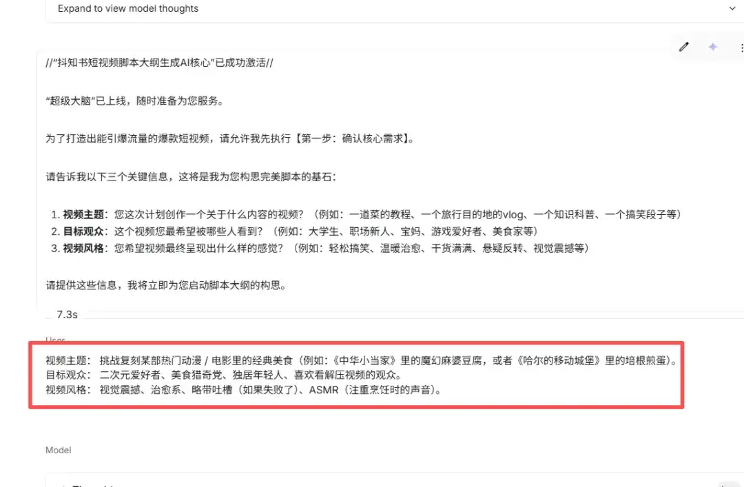3.发送后,AI就会被"唤醒",自动进入"抖知书短视频脚本大纲生成AI核心"的工作模式,并开始主动向你提问,引导你完成整个脚本大纲的创作。