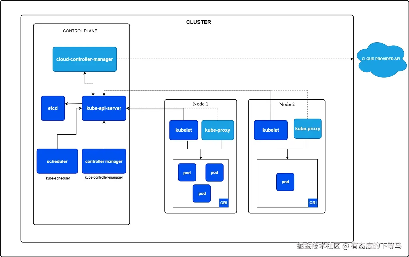 k8s控制面几个组件,核心枢纽是apiserver, 除etcd之外,其他组件都通过restful进行http通信。