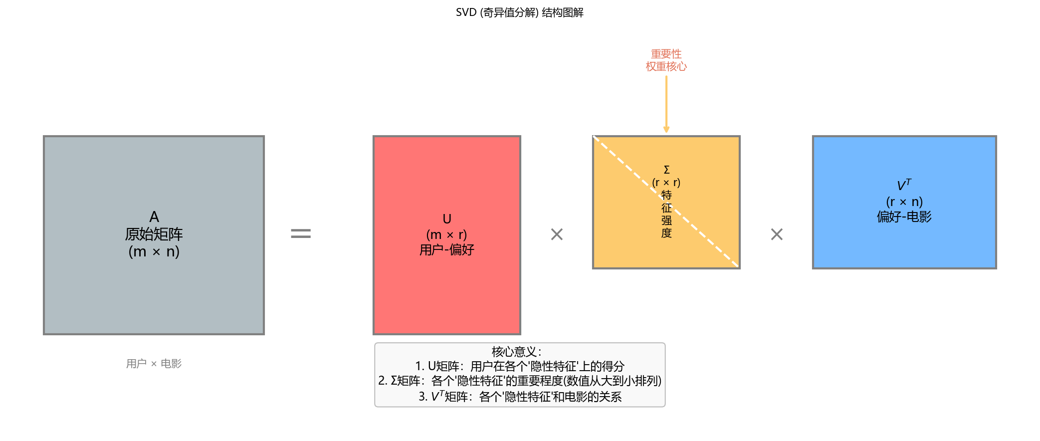 - 三大件 :它把数据拆解为 用户特征(UUU) 、特征强度(Σ\SigmaΣ) 、物品特征(VVV)。