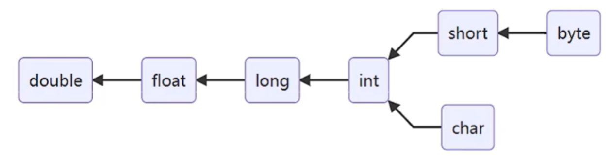 基本类型转换基于数据范围大小,分为隐式转换和强制转换,转换方向通过类型范围箭头示意