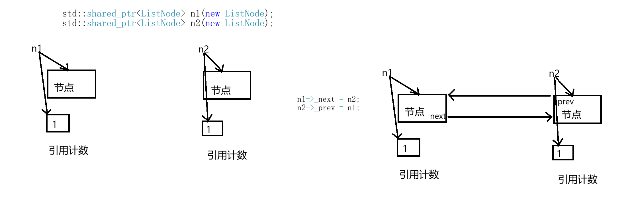 如下图所述场景,n1和n2析构后,管理两个节点的引用计数减到1。