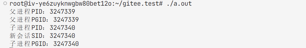 printf("子进程PID:%d\n", getpid()); // 新会话首进程PID