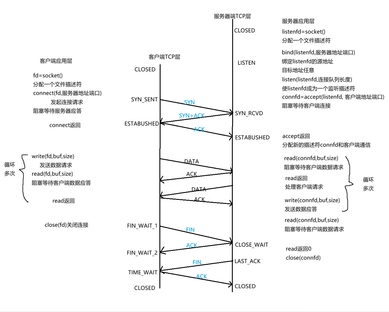 在学习socket API时要注意应用程序和TCP协议层是如何交互的: