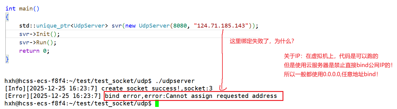 2.调用bind,将当前的文件描述符和IP/port绑定在一起,如果这个端口已经被其他进程占用了,就会bind失败。