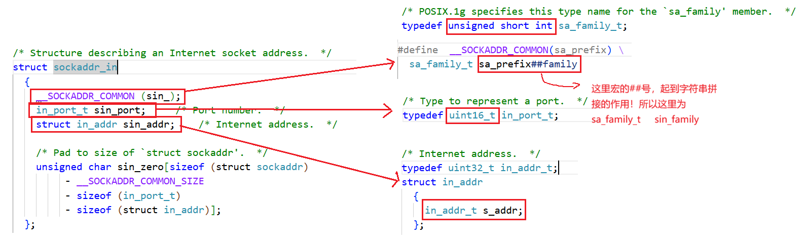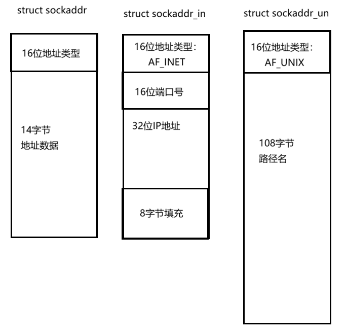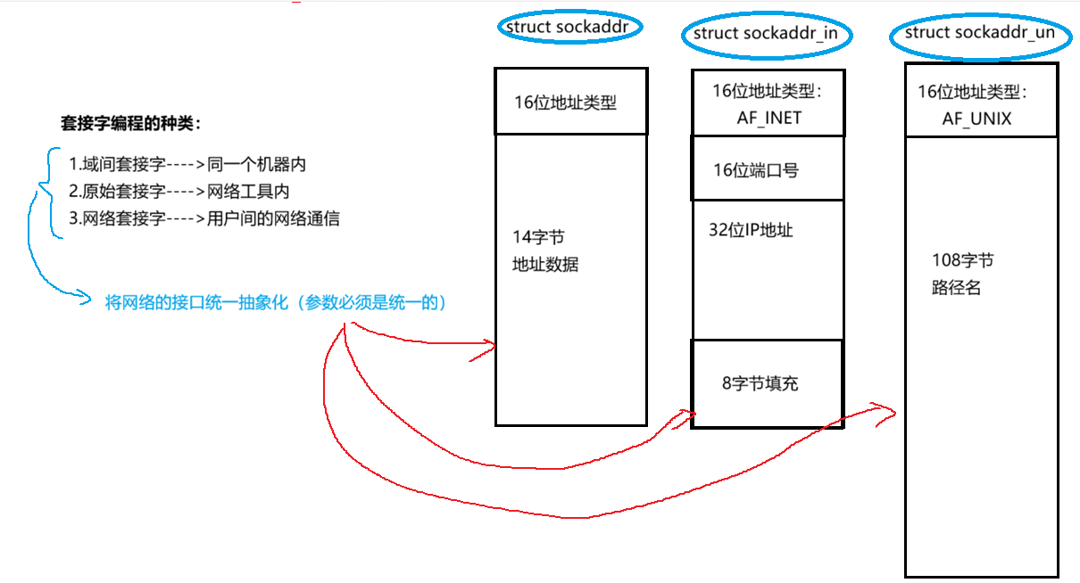 2.IPv4、IPv6地址类型分别定义为常数AF_INET、AF_INET6,这样,只要取得某种sockaddr结构体的首地址,不需要知道具体是哪种类型的sockaddr结构体,就可以根据地址类型字段确定结构体中的内容。