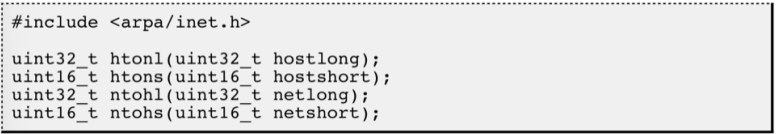 为使网络程序具有可移植性,使同样的C代码在大端和小端计算机上编译后都能正常运行,可以调用下面库函数做网络字节序和主机字节序的转换。