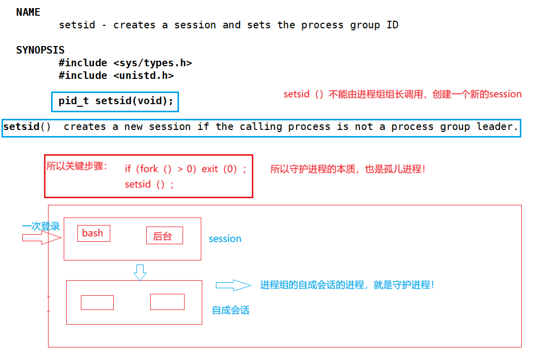注意:这个函数不能由进程组组长调用,来创建一个新的session。
