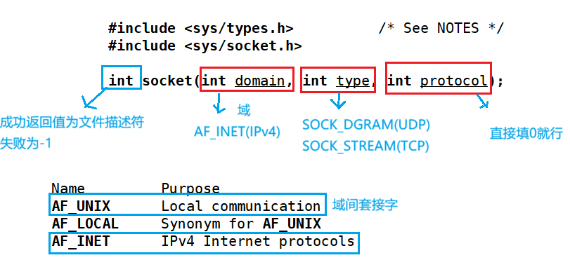 int socket(int domain,int type,int protocol);接口来完成创建socket。