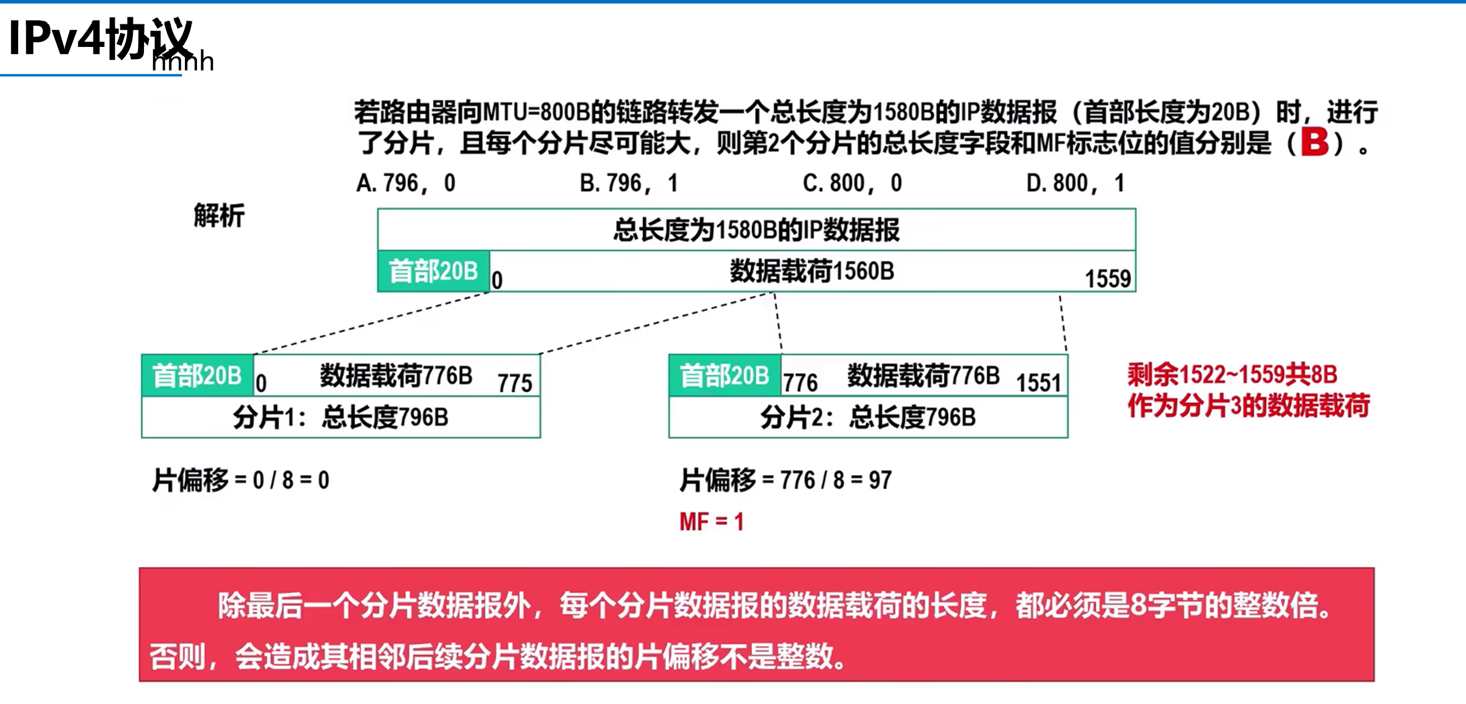 超级易错!hhhhh 注意:片偏移字段的单位是8字节,所以数据部分的长度都必须是8的整数倍(最后一个分配不强求) 所以由题:一个分片的数据部分是800-20 = 780字节,取最大的8的整数倍就是776