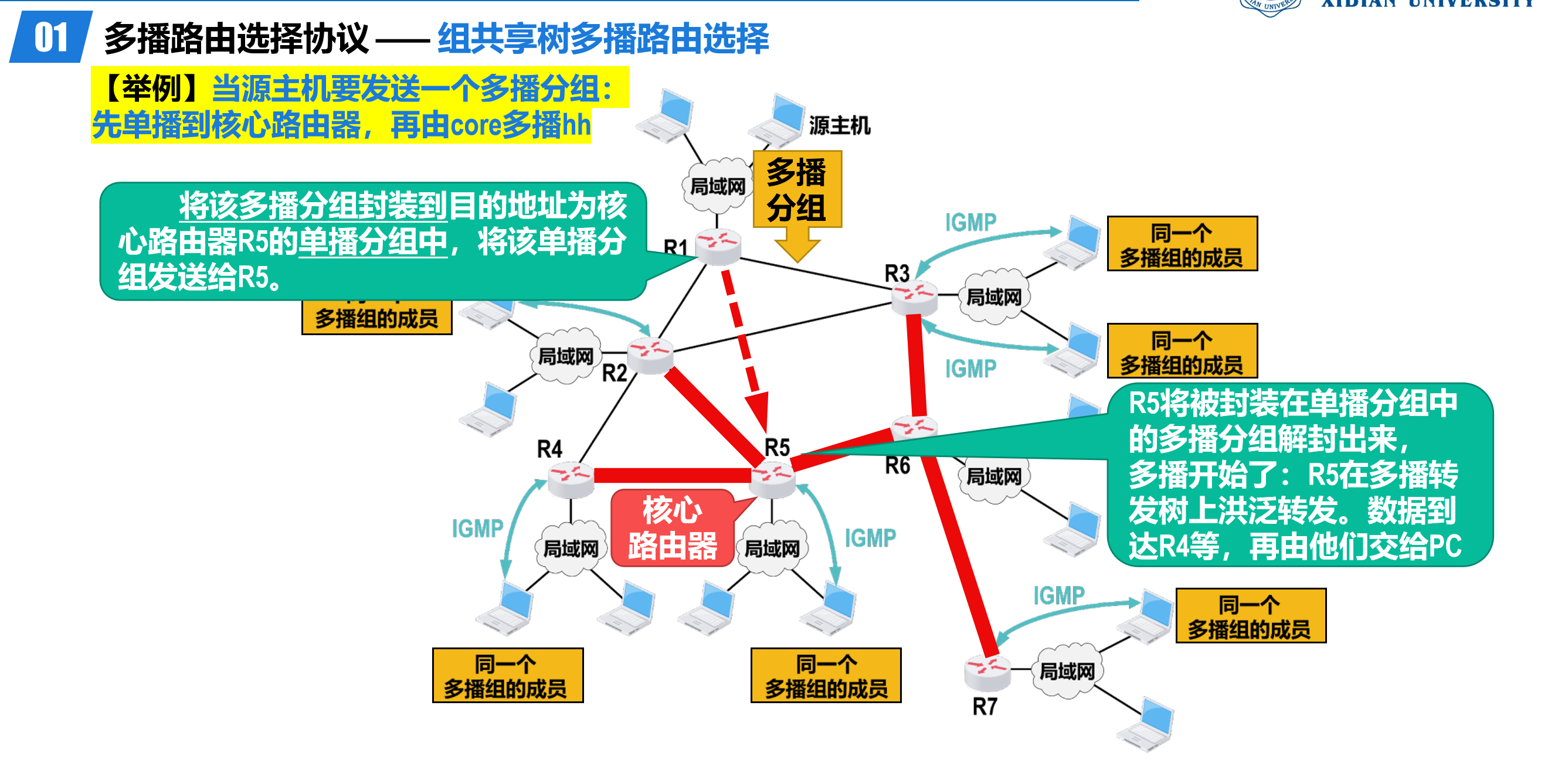 建立:第一阶段:当某个主机加入新的多播组时,该主机应向多播组的多播地址发送IGMP 报文,声明自己要成为该组的成员。 本地的多播路由器收到 IGMP 报文后,将组成员关系转发给因特网上的其他多播路由器。