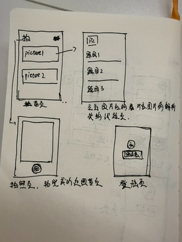 (此处应有手绘图:登录页 + 首页 + 拍照页 + 详情页)