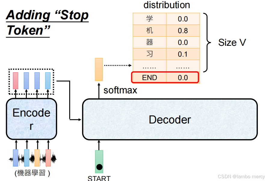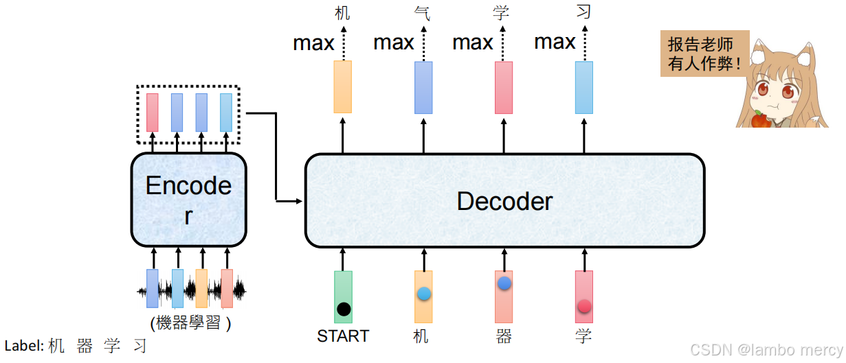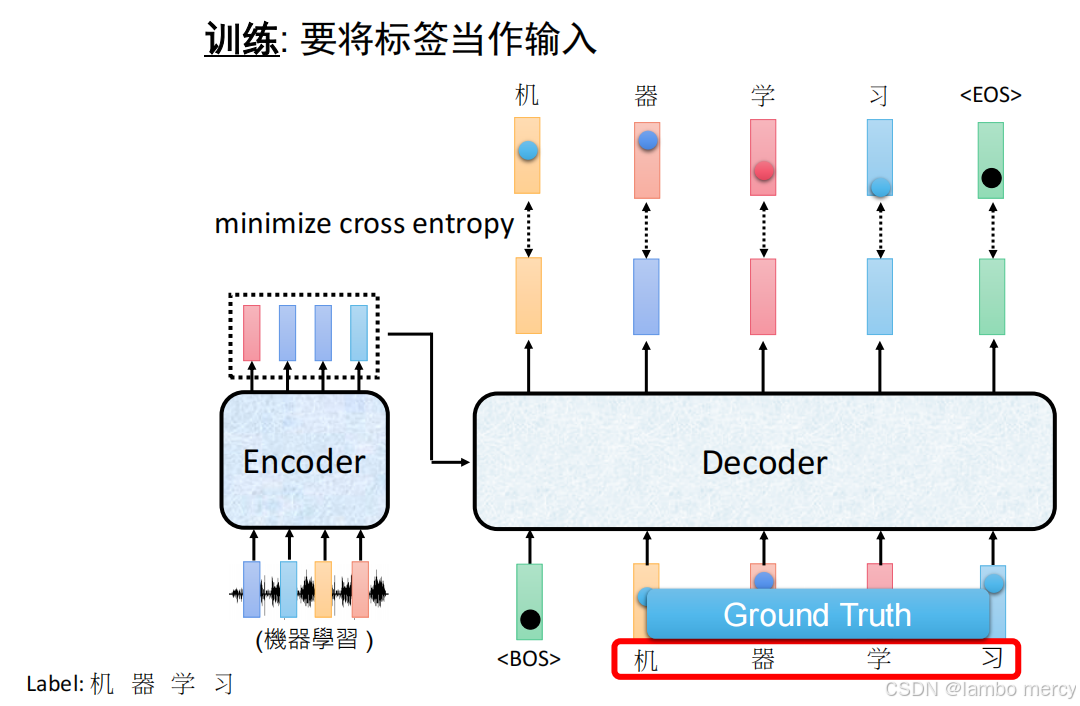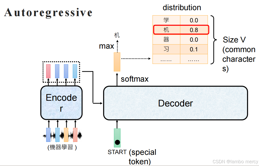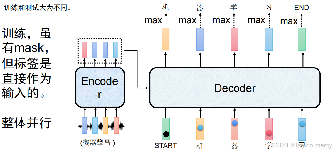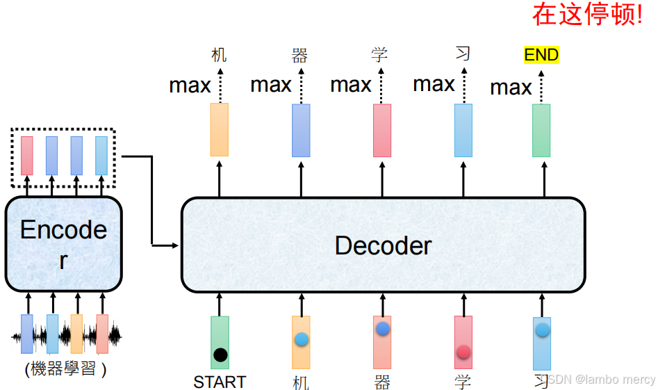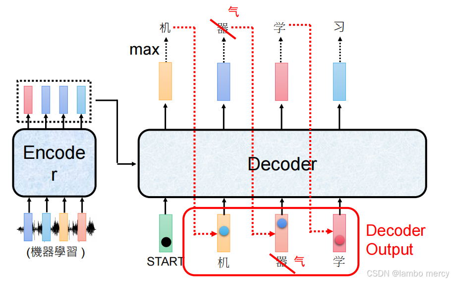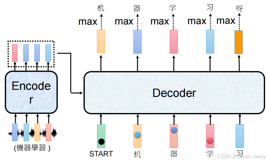 Encoder 的输出是输入序列的语义特征编码 (比如图中 "機器學習" 对应的语音,Encoder 输出的是该语音的语义特征序列),但 Decoder 的核心任务是生成连贯的目标序列: